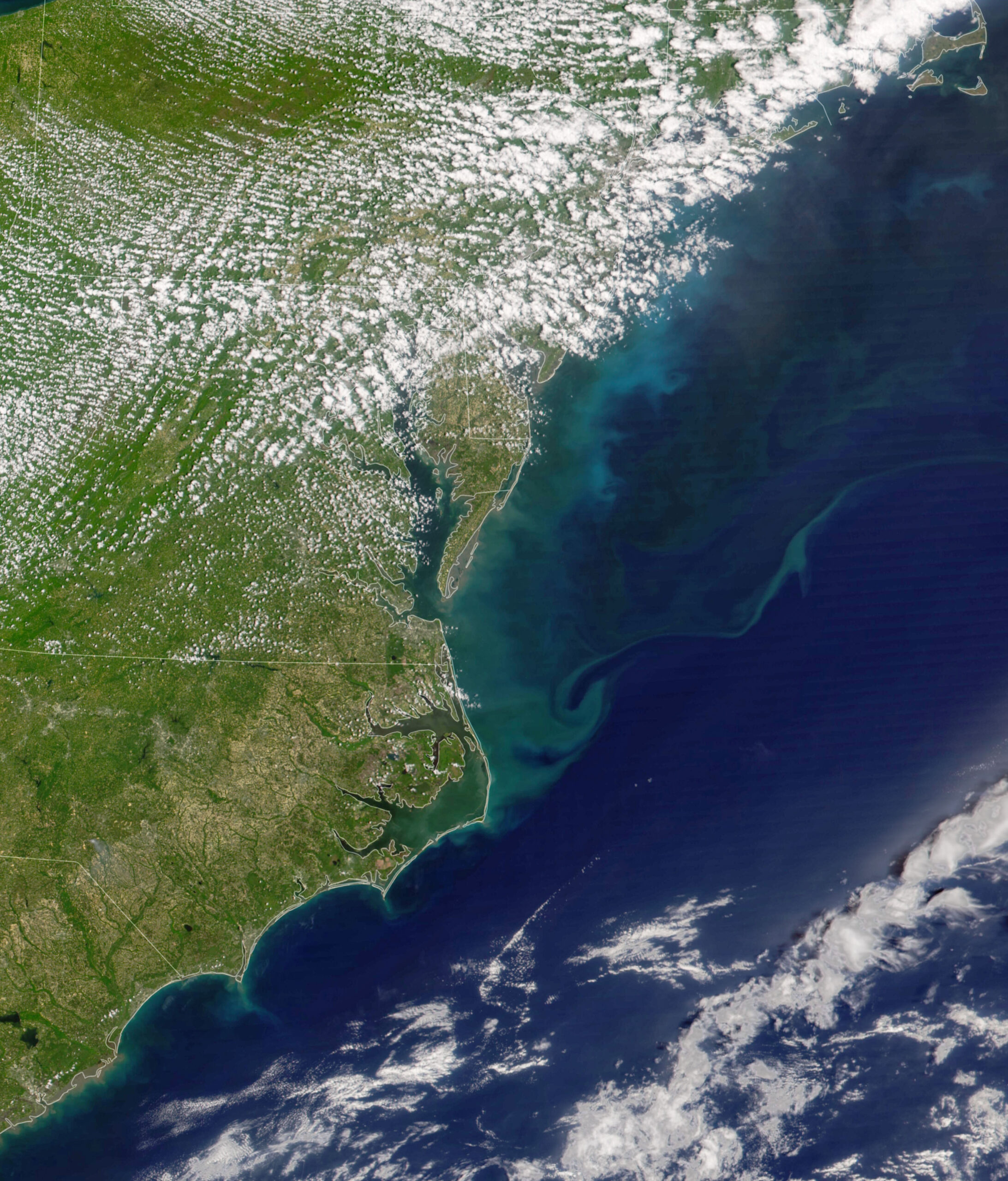 The image was captured on May 17, 2022 by the Visible Infrared Imaging Radiometer Suite (VIIRS) on the NOAA-20 satellite. The bloom was located off the coast of New Jersey, Delaware, Maryland, Virginia, and North Carolina.