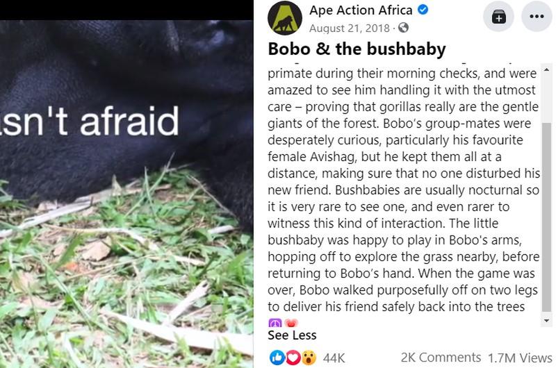 Luckily, the staff at the sanctuary had captured every minute of the unique interaction on camera. They posted it to Facebook, with the caption: “Our silverback gorilla Bobo made a surprising new friend this week — a wild bush baby!”