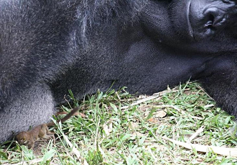 But the unique positioning of Mefou’s enclosures by the forest made for a once-in-a-lifetime encounter between a tiny wildling and a giant friendly gorilla – which soon became a huge attraction for the other apes. Photo Credit: Ape Action Africa