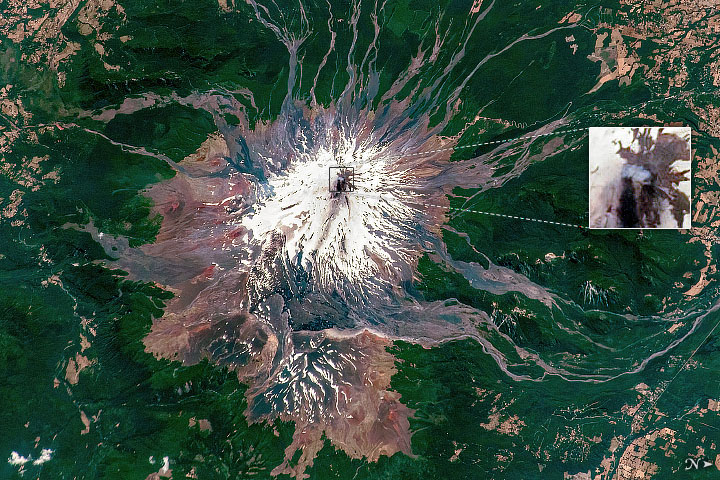 “Located along Chile’s southern Andes, Villarrica is one of the most active volcanoes in South America. In the inset, steam is coming from Villarrica’s crater. A streak of ash is visible on the volcano’s snow-covered eastern flank,” says NASA.