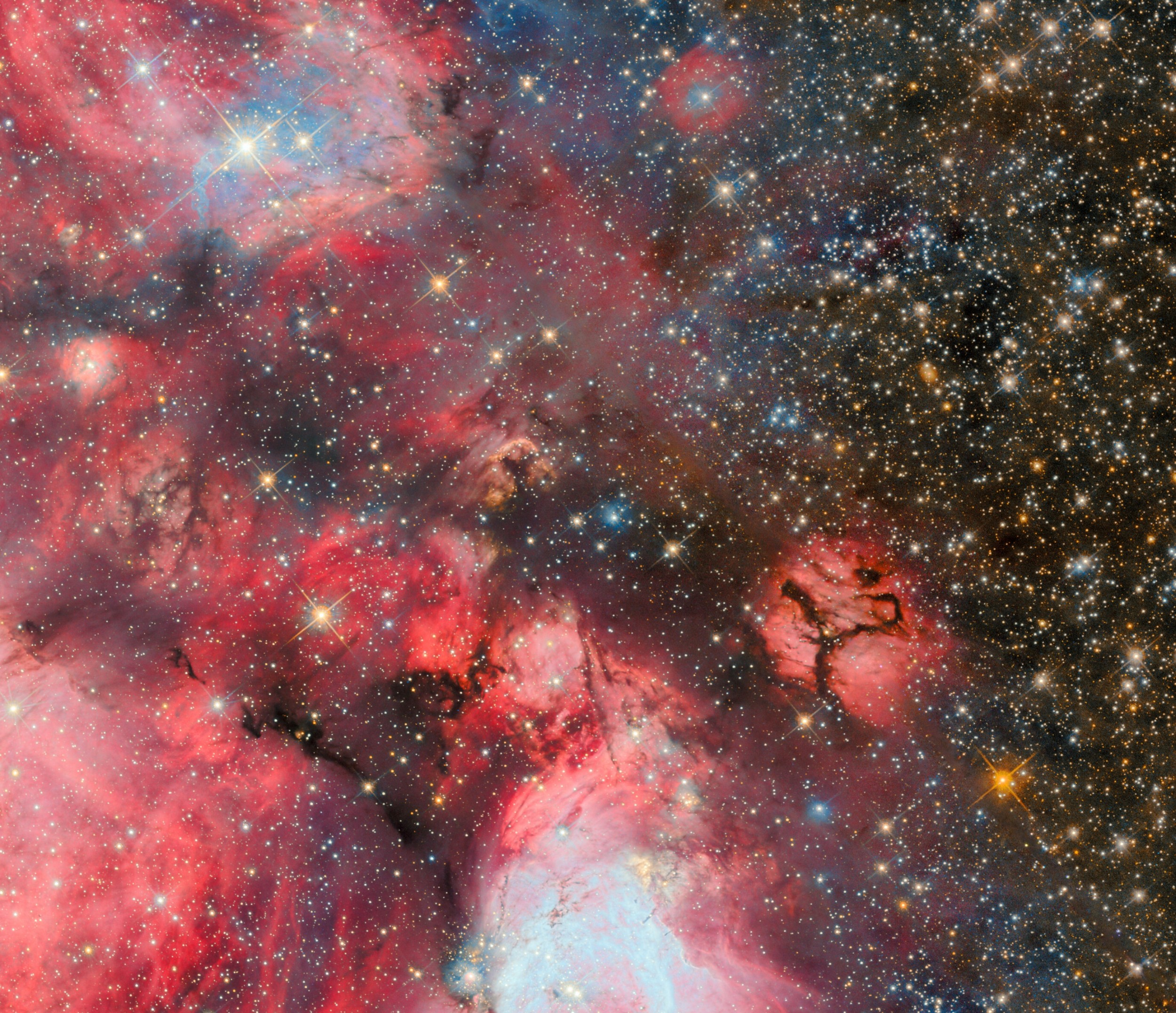 In this image, some bright stars look like they’re wrapped in reddish material, while others appear inside round, hollow-looking bubbles where the darkness of space peeks through.