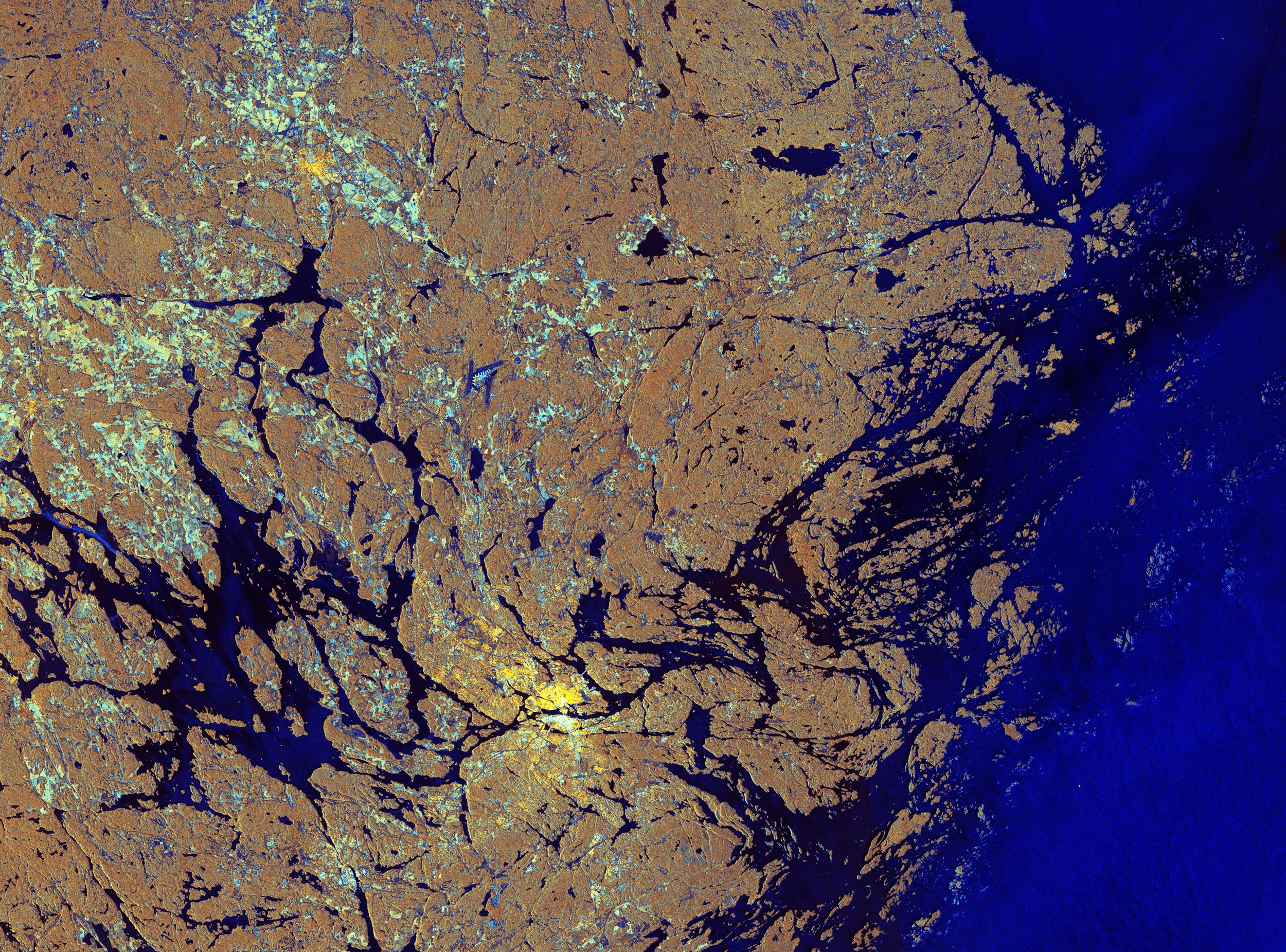 Stockholm, Sweden appears as a cluster of bright yellow radar reflections in the lower section of this image from Sentinel-1A. The satellite captured this image on February 21, 2015 in its Interferometric Wide Swath mode and dual polarization, from which the artificial color composite was generated.