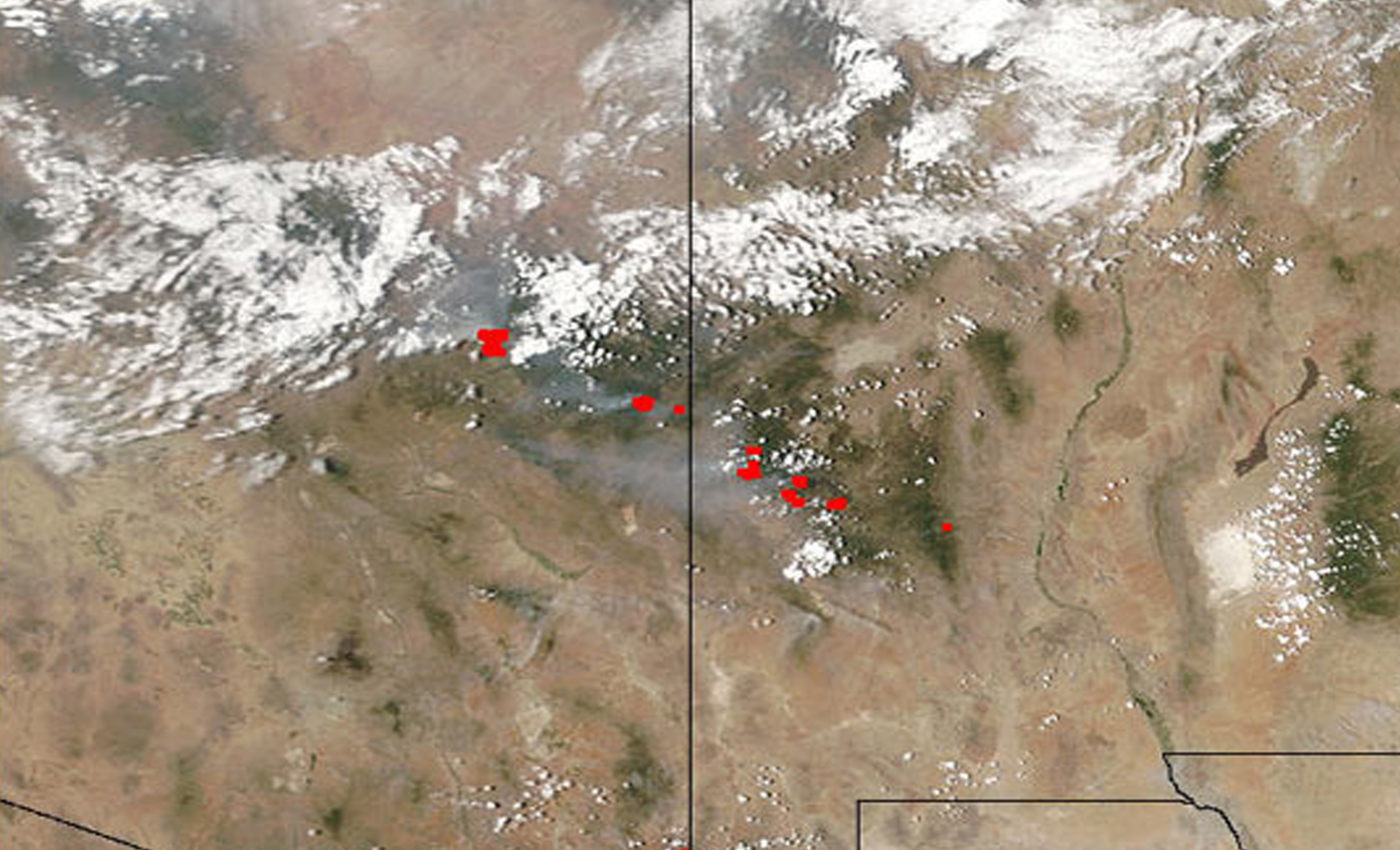 Thunderstorms have brought Storms in Arizona and New Mexico. Also a little but lightning and gusty winds to fires burning in Arizona and New Mexico. On July 13, 2003, lightning ignited a fire on the Fort Apache Reservation in eastern Arizona about two miles west of the small town of Whiteriver. The Kinishba Fire quickly exploded to several thousand acres, forcing about 5,000 people to evacuate their homes. In three days, the fire had grown to 17, 700 acres and was only 15 percent contained. This series of images from the Moderate Resolution Imaging Spectroradiometer (MODIS) image on the Aqua and Terra satellites shows the actively burning area of the Kinishba Fire (westernmost cluster of red dots) and several others burning in Arizona (left) and New Mexico (right).