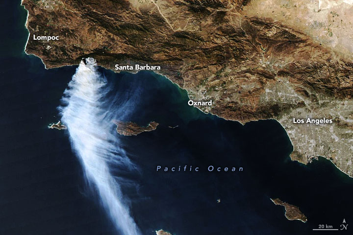 Today’s Image of the Day from NASA Earth Observatory features a satellite view of the Alisal fire located northwest of Santa Barbara, as strong winds pushed smoke over the Pacific Ocean. The fire ignited near the Alisal reservoir on October 11. Two days later, it had already consumed 13,400 acres.