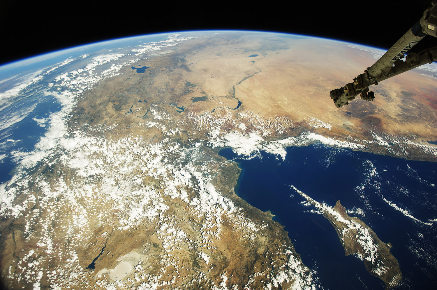 The cradle of those religions—and of much of modern civilization—was captured on September 7, 2014, in a photograph by an astronaut on the International Space Station (ISS). At the time, the ISS was in orbit over Turkey and the photographer was looking east across Cyprus and the Mediterranean Sea.