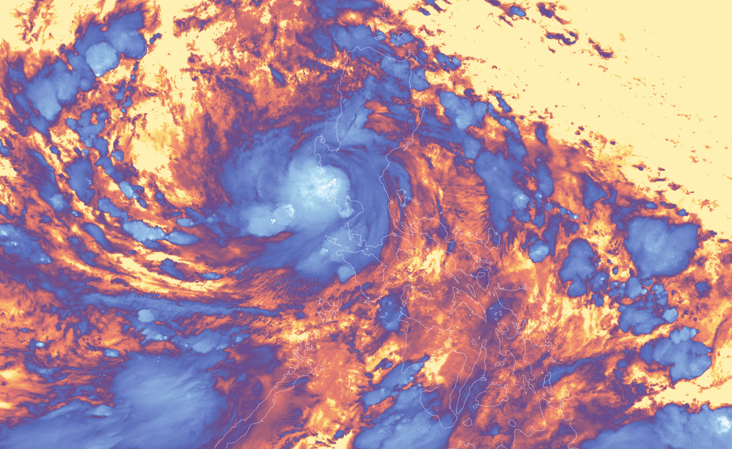 “The Visible Infrared Imaging Radiometer Suite (VIIRS) on Suomi NPP acquired this image of Noru on September 25, 2022, a few hours after landfall. Clouds are shown in infrared brightness temperature data, which is useful for distinguishing cooler cloud structures (purple) from warmer surfaces below (yellow). The coolest temperatures (white) are generally associated with the tallest clouds.”