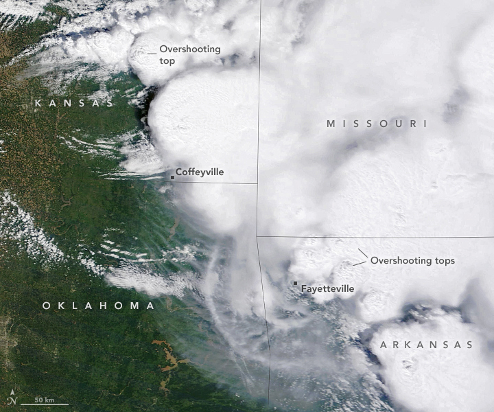 “When the Moderate Resolution Imaging Spectroradiometer (MODIS) on NASA’s Terra satellite acquired the natural-color image, a line of strong thunderstorms stretched from eastern Kansas to Little Rock, Arkansas,” reports NASA.