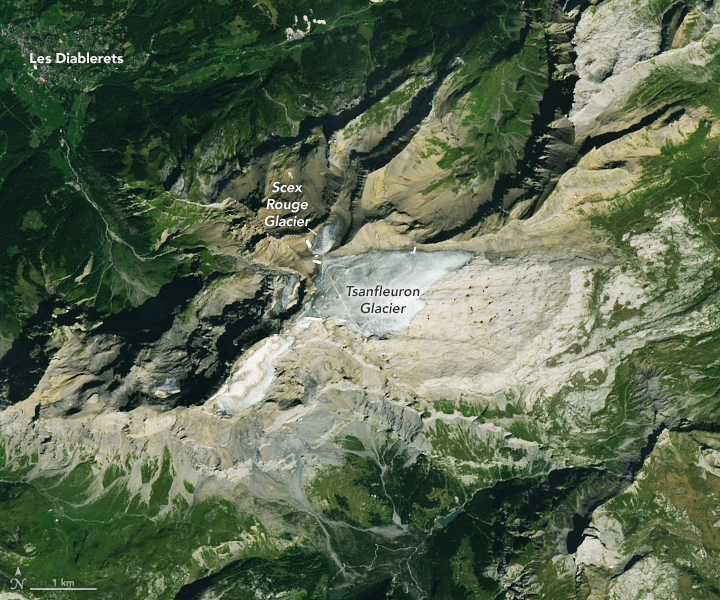 “The glaciers rest on different sides of a mountain slope, but they have long been connected at Tsanfleuron pass,” says NASA.