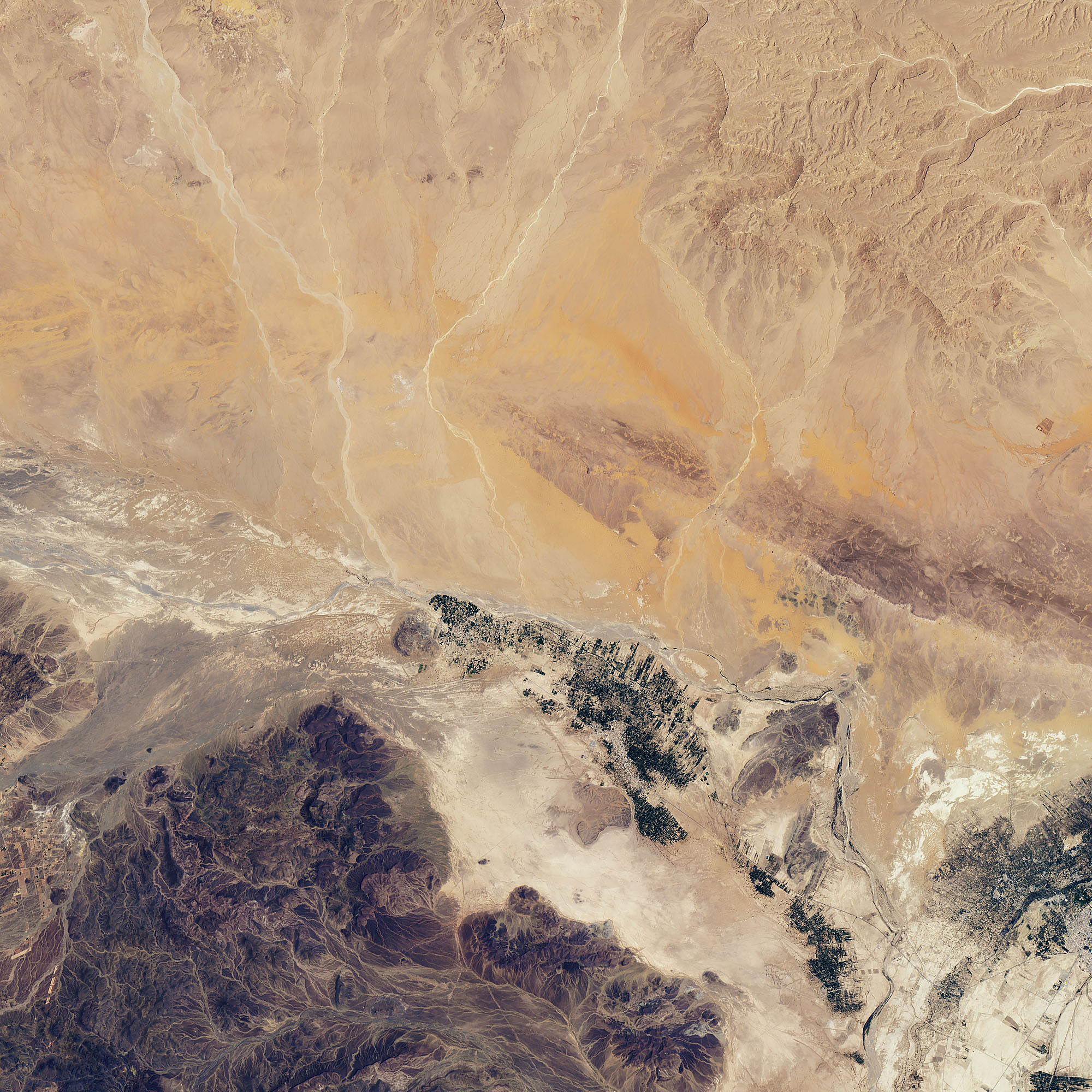 In Landsat images of the Tafilalt oasis of southeastern Morocco, dozens of thin lines run across the desert from the Anti-Atlas mountains toward the town of El Jorf. These are qanats (khettaras in Moroccan)—ancient underground water channels designed to transport water down slopes without active pumping.