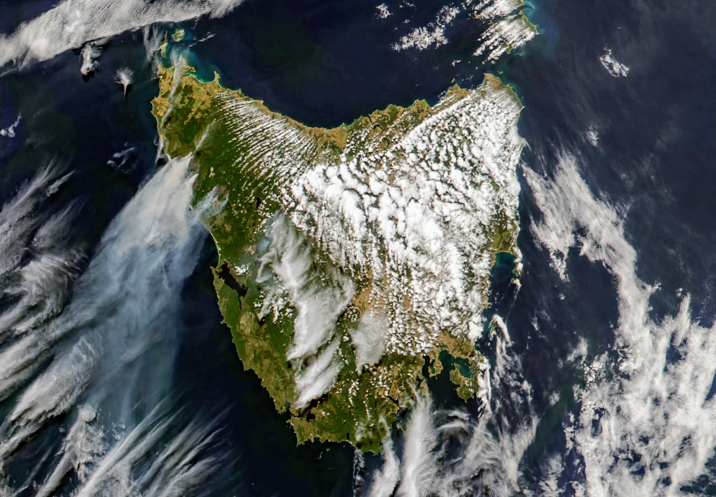 Today’s Image of the Day from NASA Earth Observatory features smoke streaming from Tasmania, where bushfires were ignited by dry lightning strikes earlier this month.