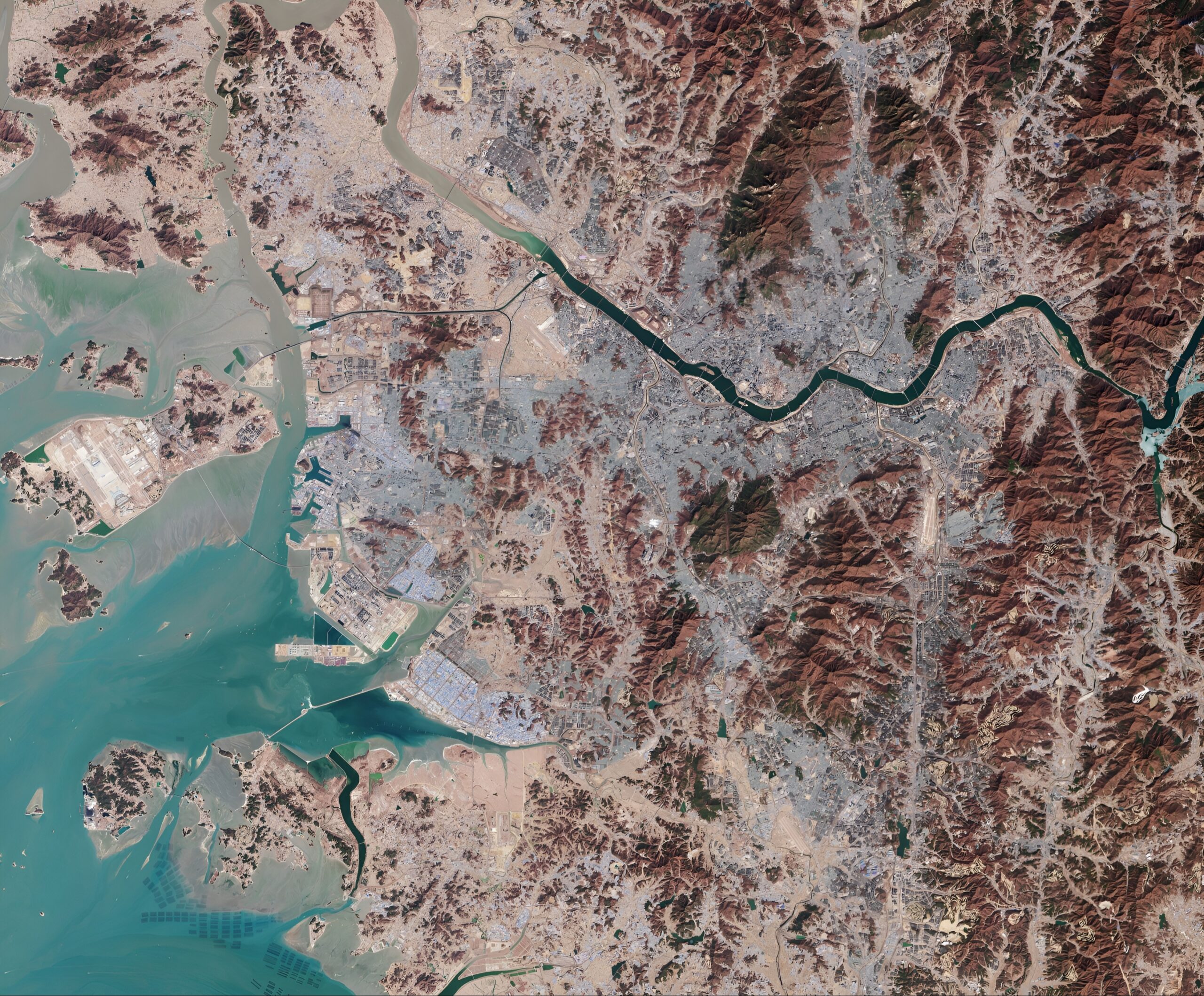 “Situated some 50 km south of the North Korean border, the metropolitan area of Seoul appears as the grey area in the center of the image,” says ESA.