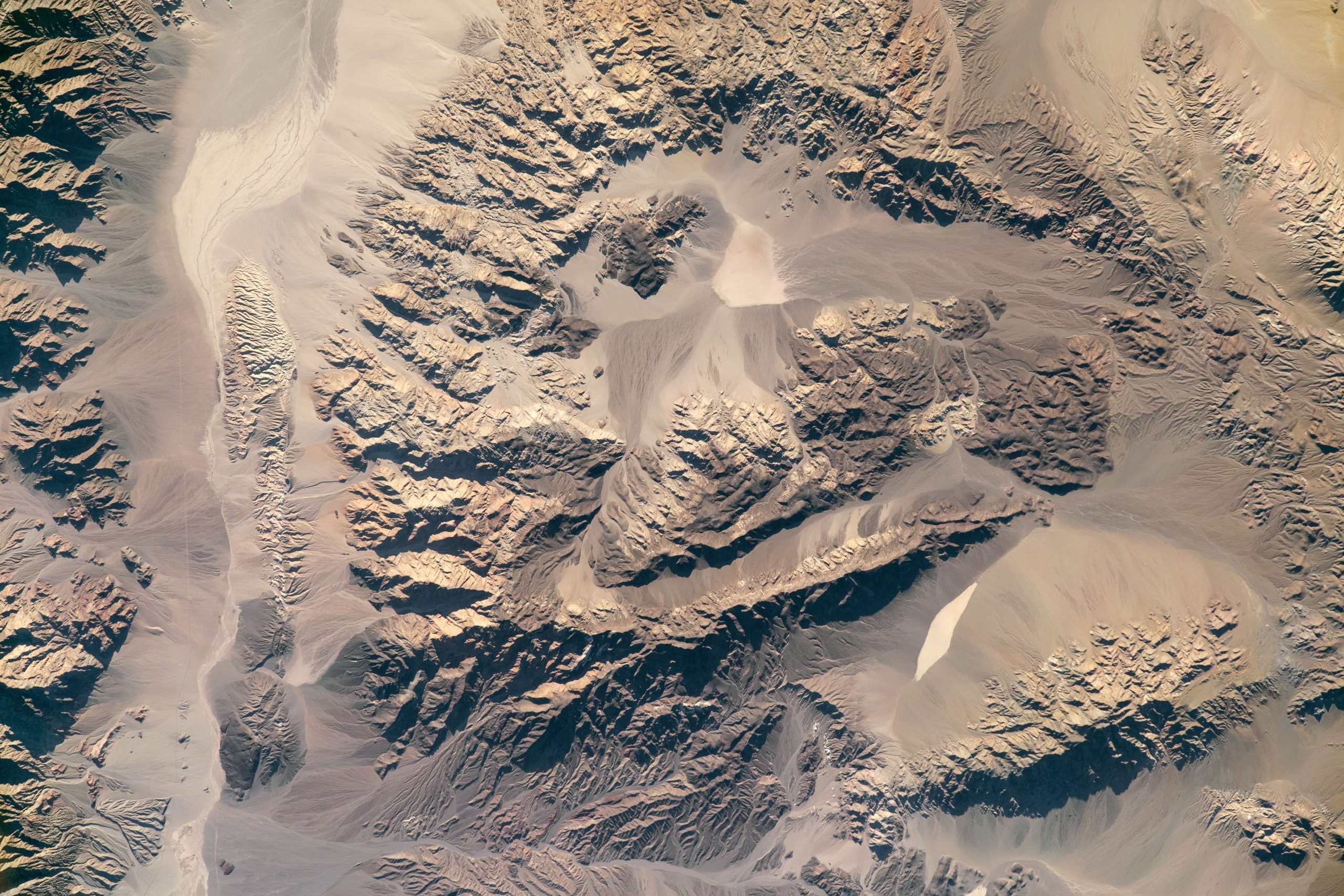 In this image, which was captured by an astronaut onboard the International Space Station, shadows highlight the sharp angles and slot canyons of the Owlshead Mountains.