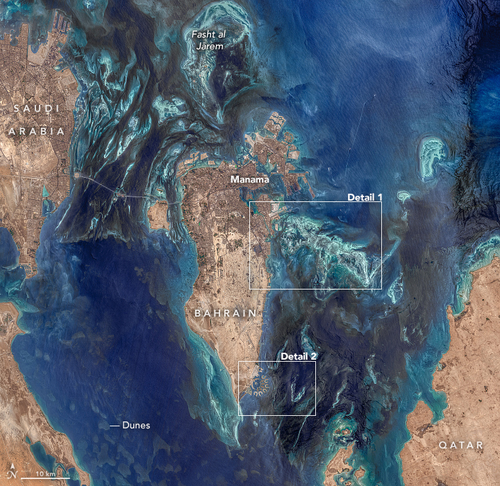 “Perhaps most obvious submerged features in the images are the large reefs surrounding Bahrain, visible as the light-green areas offshore.” “Historically, these structures known as ‘fasht’ were coral or pearl oyster reefs. Today, most of them are dead coral skeletons, although some rocky surfaces still have living corals attached to them, according to Ghoneim, who has studied this underwater habitat with satellites and field surveys.”