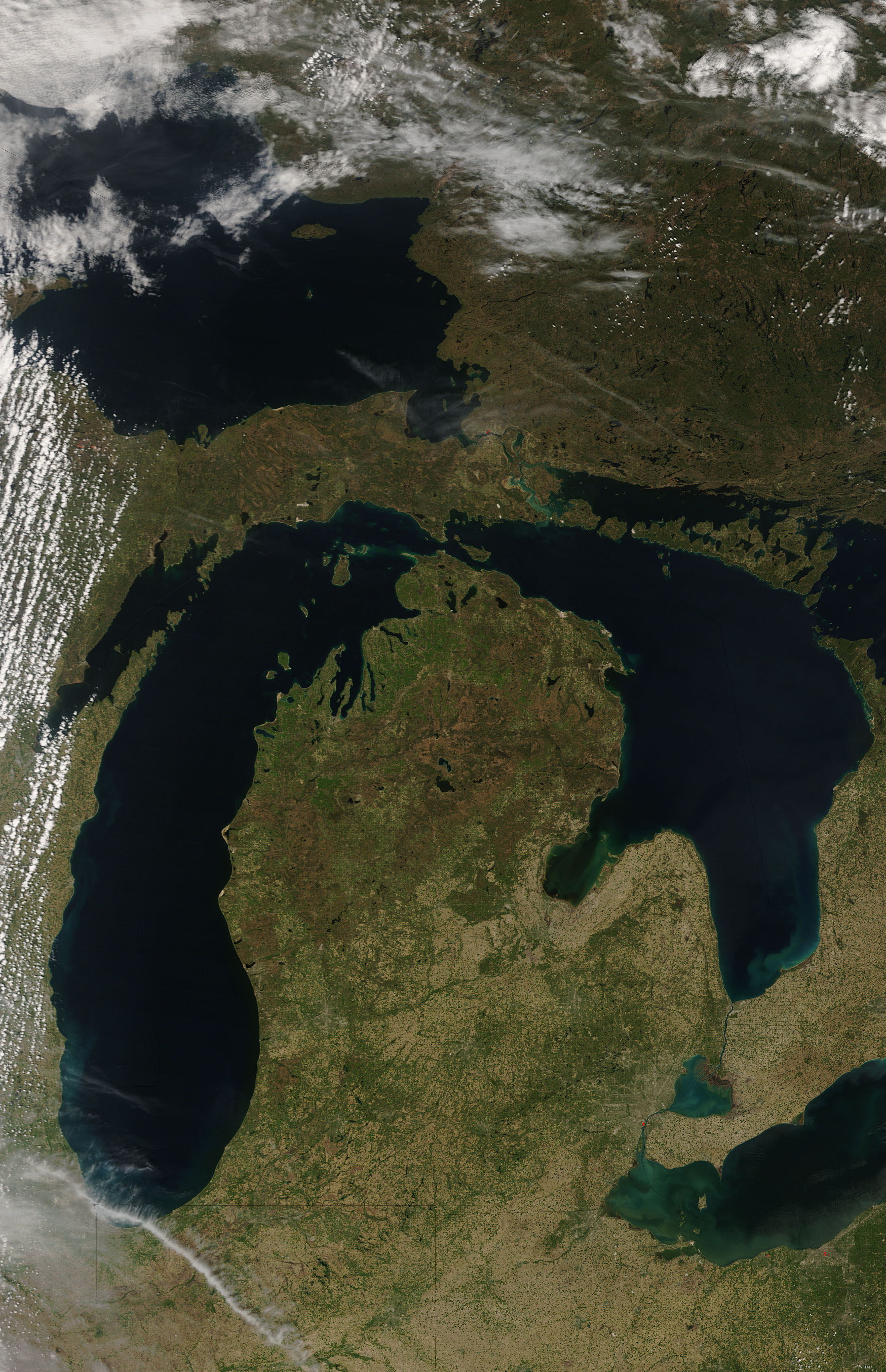 The Great Lakes region are shown in this image acquired by the MODIS on board the Aqua satellite on May 8, 2006. The Great Lakes are on or near the US/Canada border.