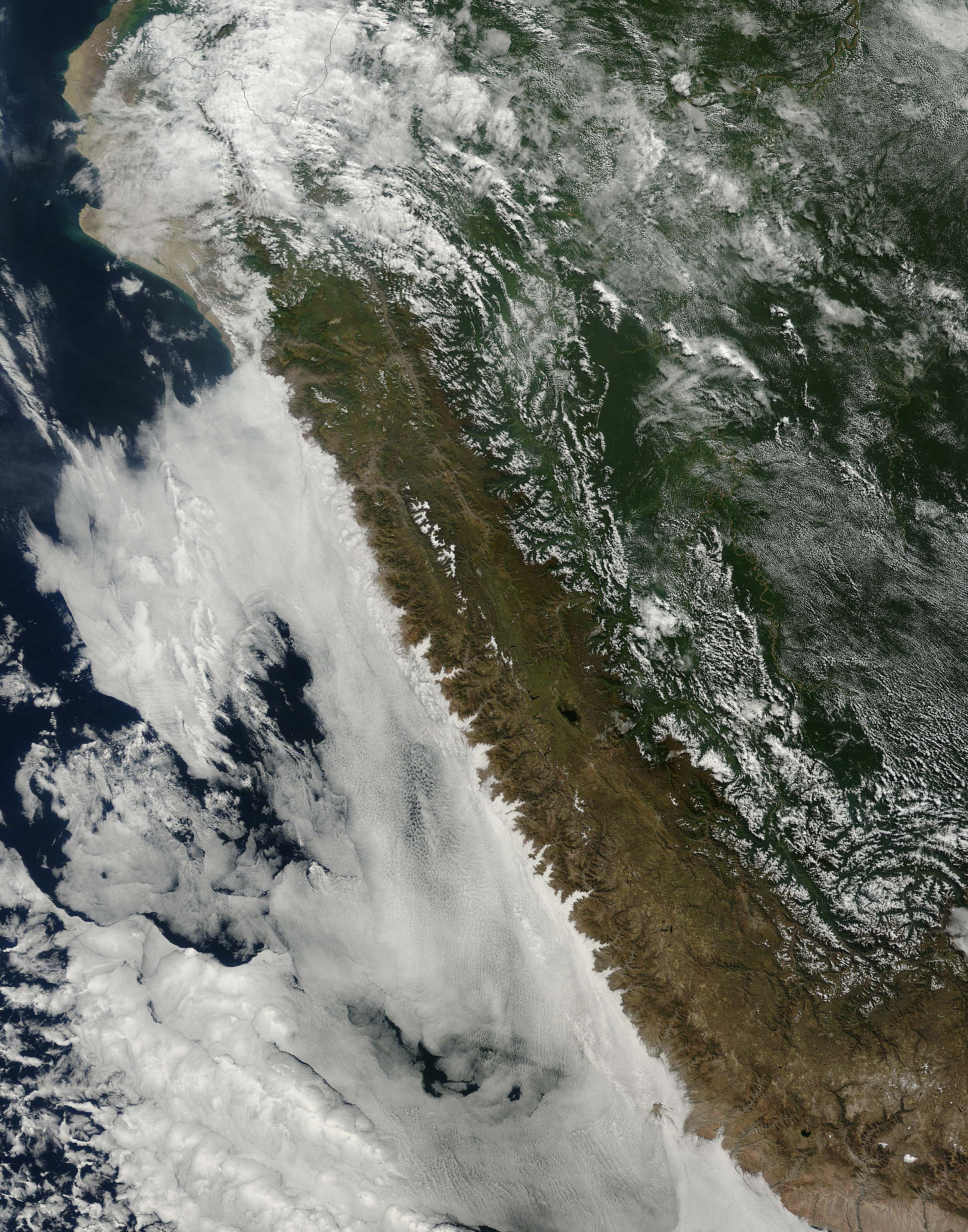 Along the coast, the cloud layer has pushed in to cover Peru’s coastal plain, obscuring Lima and the other cities along the coast. Since the marine clouds are low—just a few hundred meters off the ground—the Andes Mountains block their eastern movement. The river valleys are the only places moist and cool enough for the low clouds, or fog, to persist. In the lower, close-up image, notice how tendrils of fog trace the river valleys.