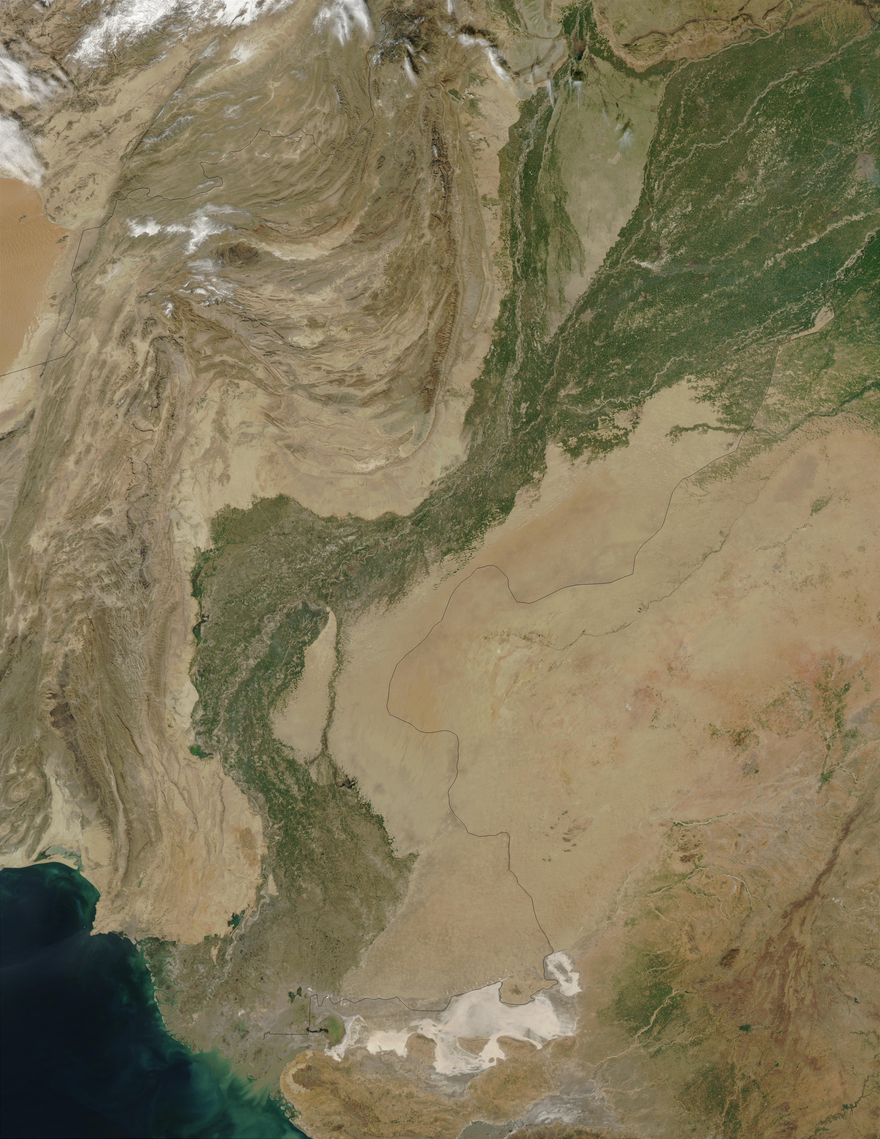 The Indus River Valley, Pakistan. This pair of true- and false-color images feature the Indus River Valley, a lush oasis of vegetation made possible by the Indus River, which is visible as a thin black thread heading toward the Arabian Sea in the false-color image.