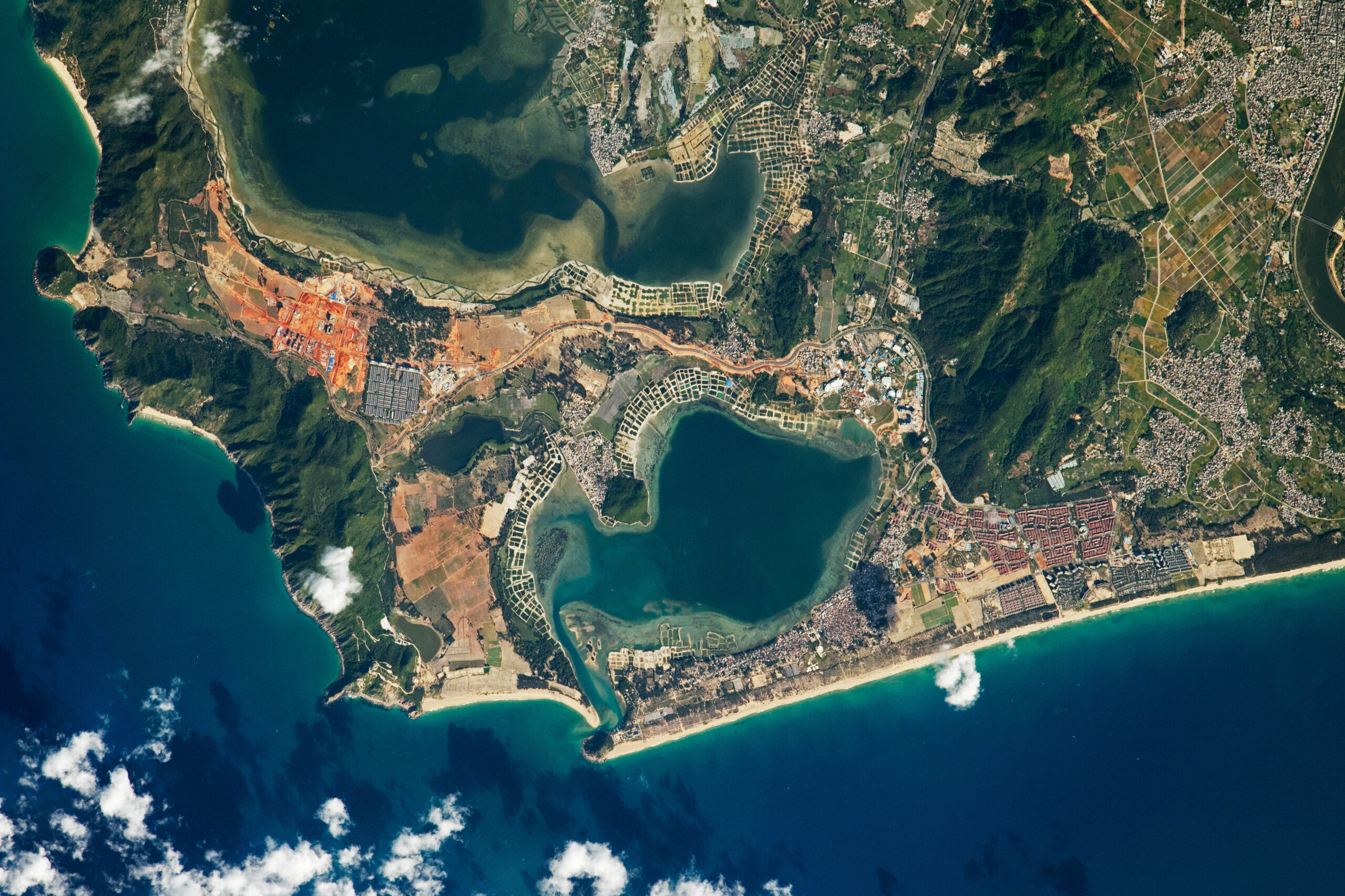 According to NASA, the photograph focuses on the landscape around Gangmen Harbor and captures many typical characteristics of Hainan: forested mountain terrain juxtaposed with dense populations.