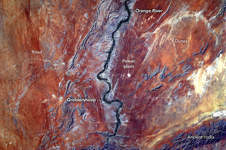 In this image, which was captured by a camera system on the International Space Station, ancient rocks and sand dunes are visible. You can also see South Africa’s largest river, the Orange River, winding toward the Atlantic Ocean.