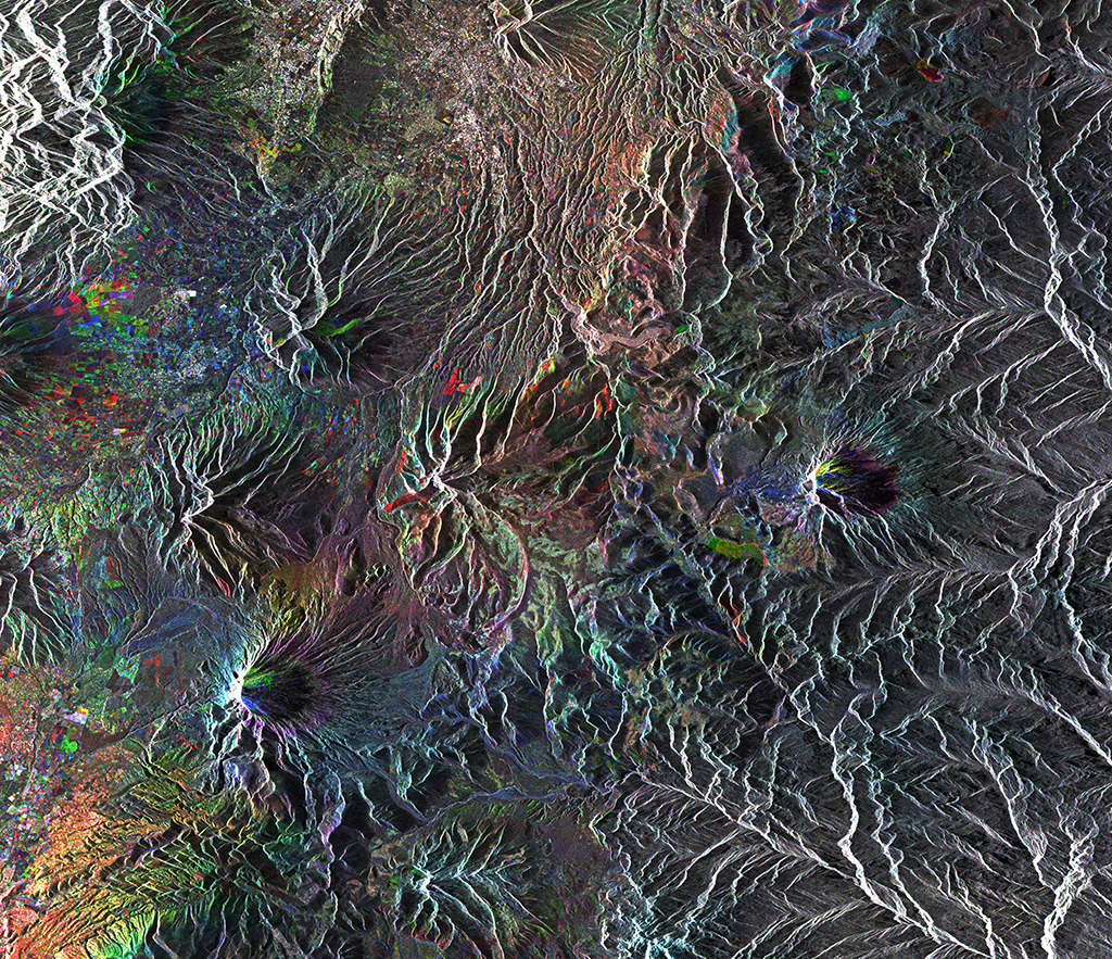 The composite image was created by combining three Envisat radar passes from 2006 to 2010. According to the ESA, the vibrant colors across the highlands represent changes in the land’s surface over the years.