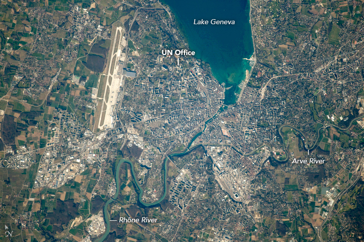 This photograph was captured on April 6. 2018 at the ISS Crew Earth Observations Facility and is provided by the Earth Science and Remote Sensing Unit at the Johnson Space Center.The Rhone River flowing out of Lake Geneva