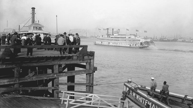 The Mississippi riverboat in the background of this shot from about a century ago is the S.S. Sidney. This rear-paddled vessel was built in 1880 for Captain William M. List, who named the boat after his mother. In 1911 the Streckfus Steamers Company acquired the craft. Its new owners were said to be the first operators to have a New Orleans jazz band playing live on a Mississippi steamer. The legendary Louis “Satchmo” Armstrong enjoyed his first paid employment as a musician aboard Sidney in 1919. Photo Credit: Bettmann/Getty Images