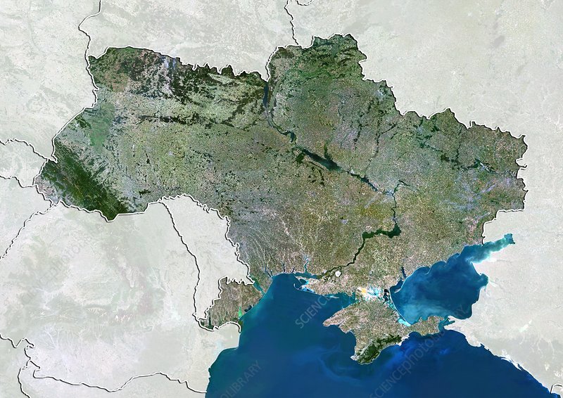 Both the Black Sea and the Sea of Azov show swirls of color in their waters. These colors are likely to be blooms of aquatic plants like phytoplankton or algae, though some might be sediment from the Dnieper and other rivers. In the case of the Azov, the cloudiness of the water is more likely to be from sediment; the sea is a maximum of 13 meters deep, and getting shallower as the Don and Kuban rivers empty sediment as well as fresh water into it. The Kerch Strait connects the Sea of Azov to the Black Sea in the lower right of the image.