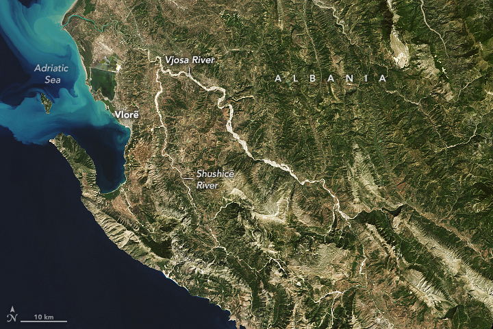 “In Greece (just southeast of this image), the river is called the Aoös and flows through the rugged terrain and dense forests of Vikos-Aoös National Park. It joins with a large tributary (the Sarandapor) near the border with Albania and then navigates through a sequence of steep canyons.”