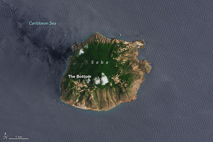 Today’s Image of the Day from NASA Earth Observatory features Saba, a small island in the northeastern Caribbean Sea. Saba is the top of a volcano that became active during the Pleistocene era.