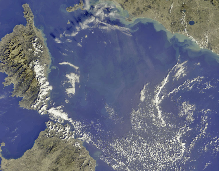 The islands of Corsica and Sardinia can be seen in the west with coast of Tuscany and the island of Elba to the northeast.