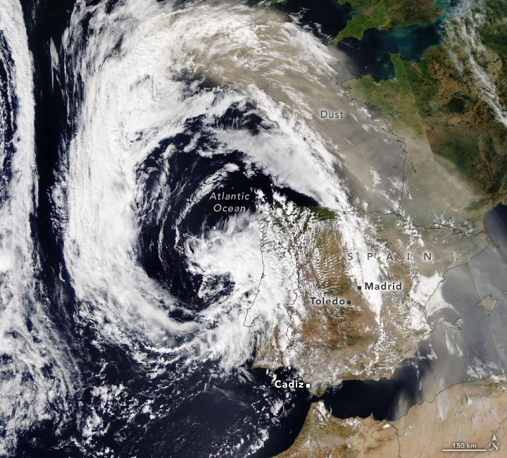 “The storm’s winds carried Saharan dust from Morocco and Algeria over eastern Spain, southern France, and the Atlantic Ocean.”