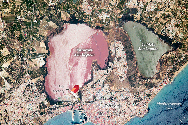 “A salt factory is located on the southeastern margin of the Torrevieja Lagoon. These lagoons produce hundreds of tons of salt every year and have fueled much of the local economy for centuries,” reports NASA.