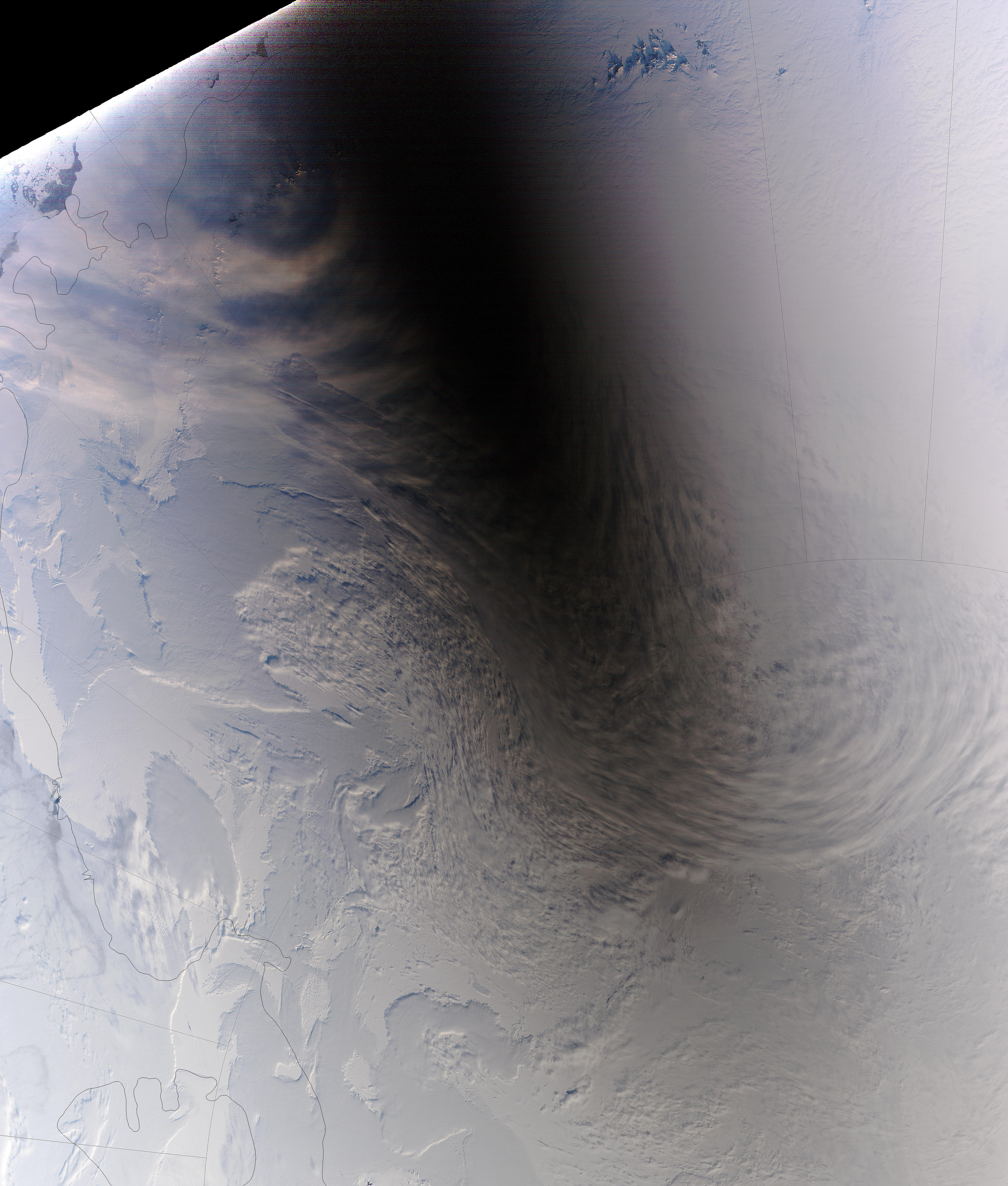The moon cast a long shadow over Antarctica on November 23, 2003, in a total solar eclipse. The sun typically hangs low on the horizon during the southernmost continent’s almost-summer months, so when the Moon moved between the Sun and the Earth, its shadow fell in a roughly 500-kilometer long oval like the long shadows of a early summer dawn. At the time this image was taken, the sun was at approximately 15 degrees above the horizon. The shadow’s long circular shape is the same pattern a flashlight casts an the floor when held at a similar angle.
