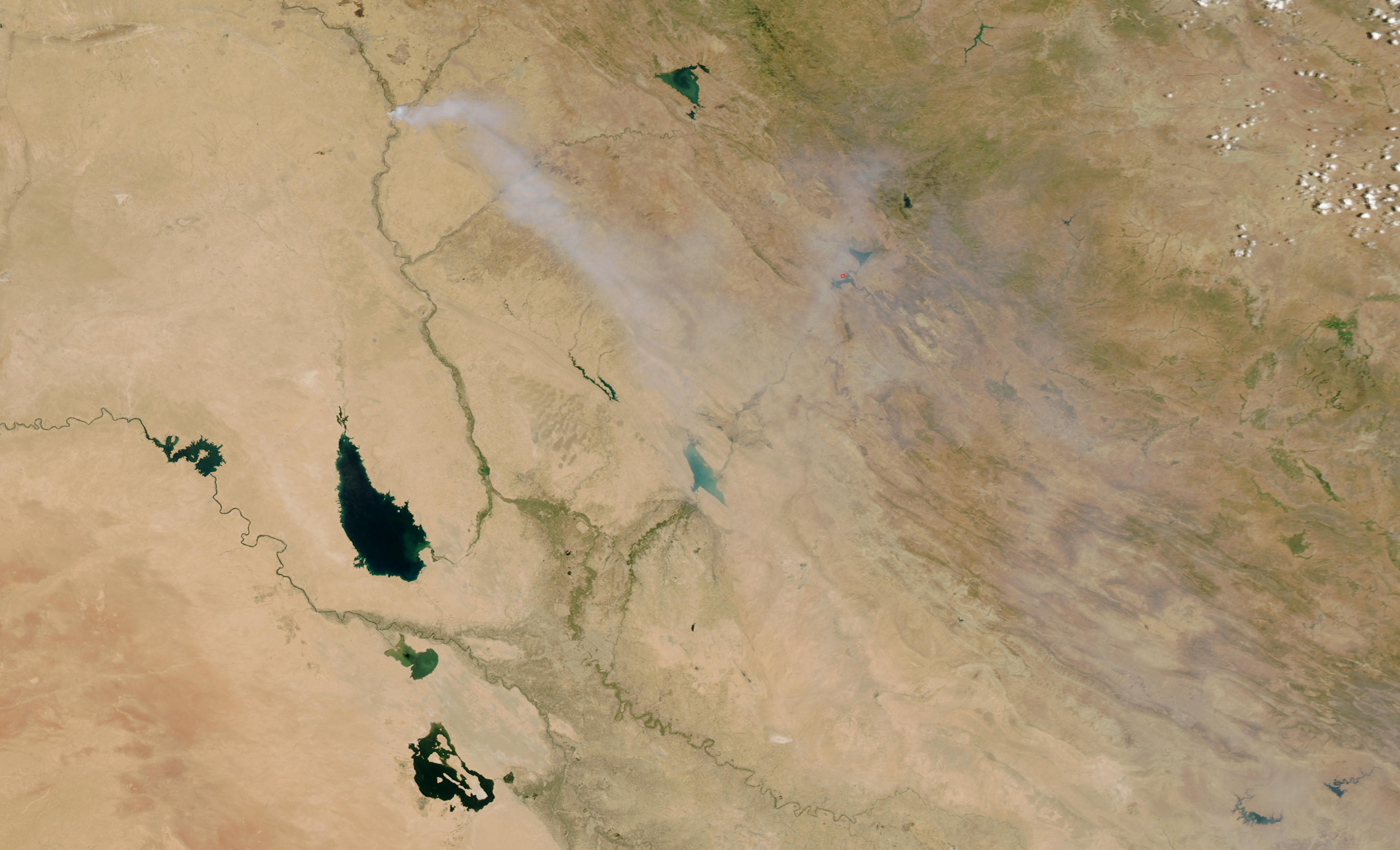A fire burning at an industrial sulfur processing facility in northern Iraq at the junction of the Tigris (flowing in from North) and Great Zab (northeast) Rivers billowed white smoke over Iraq and other Middle Eastern countries beginning on June 25, 2003. The fire continued to burn for two weeks, spreading the toxic, sulfur-containing smoke over a wide area.