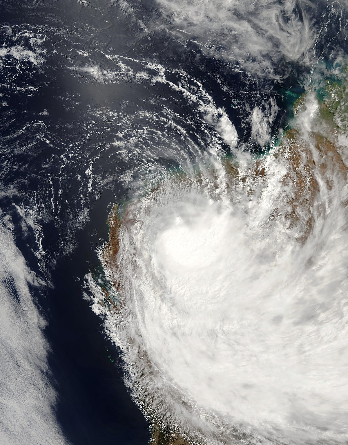 At this time, the cyclone had peak winds of roughly 30 knots or 35 miles per hour (1 knot = 1.15 mph). As the image shows, the storm system covered an enormous area, extending over almost the entire extent of Western Australia. With it came heavy rain and substantial flooding to the Pilbara Region, the northwestern corner of Western Australia, where the storm system came ashore.