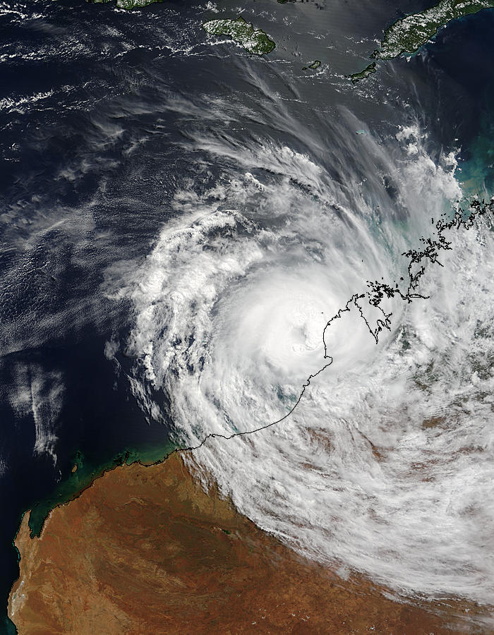 The Moderate Resolution Imaging Spectroradiometer (MODIS) on the Aqua satellite captured this image of Fay on March 26, 2004, at 5:55 UTC, 1:55 pm in Western Australia. The high-resolution image provided above has a resolution of 500 meters per pixel. The image is available in additional resolutions, including MODIS maximum resolution of 250 meters per pixel. Therefore Tropical Cyclone Fay has caused massive damage in the area. While no fatalities were reported, the cyclone brought record-breaking rainfall to Australia, which led to a sharp decrease in the country’s gold output. The cyclone also caused minor damage in the Pilbara region of Western Australia. In the spring of 2005, the Australian Bureau of Meteorology retired the name Fay from use, and it will never be used again as a cyclone name.