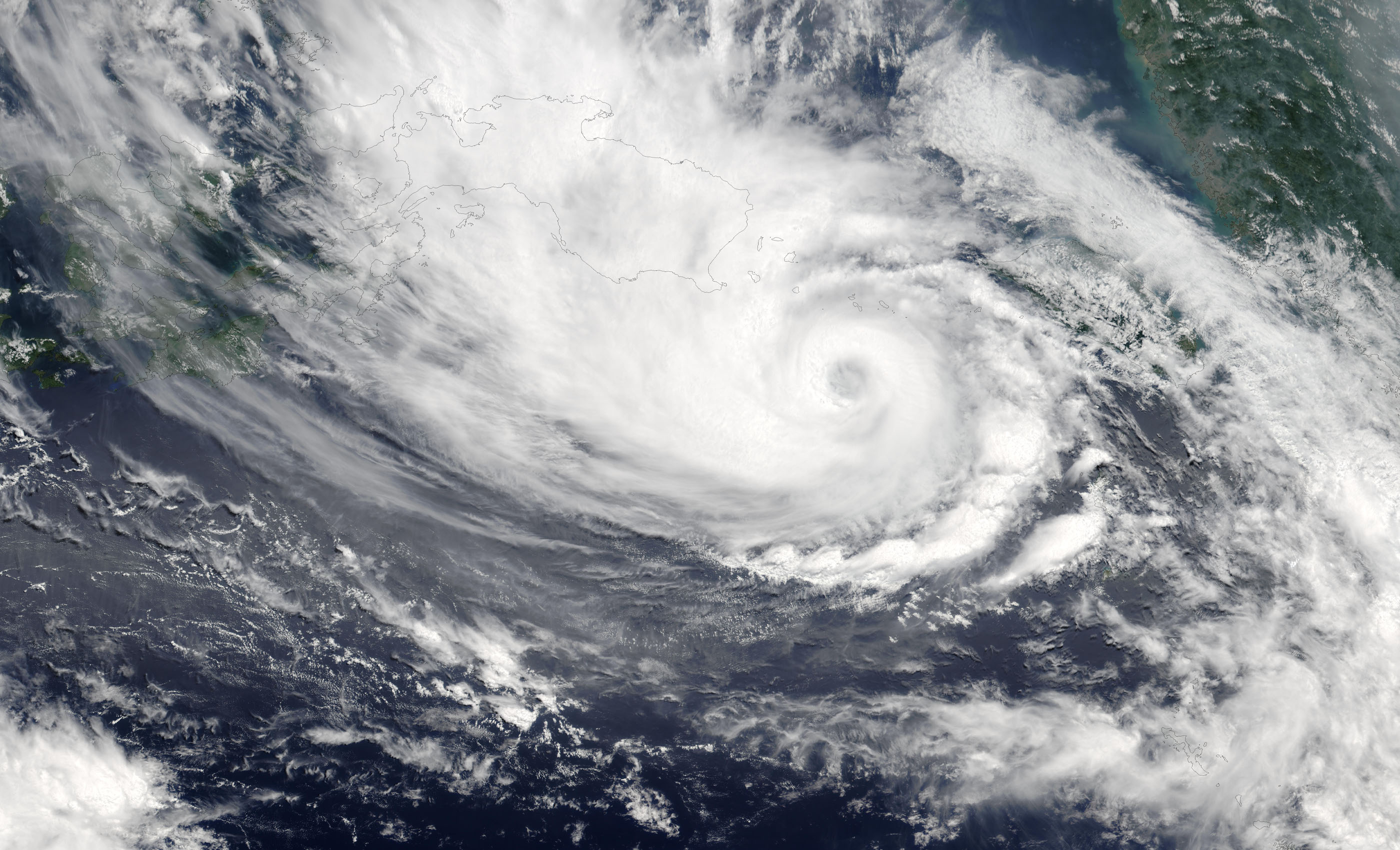On Tuesday, June 17, 2003 the MODIS instrument onboard the Aqua spacecraft captured this true-color image of Tropical Cyclone Soudelor in the Philippine Sea. At the time of the image, Soudelor (07W) was centered near 22.0 degrees north and 123.5 degrees east, and had sustained winds near 105 mph and gusts to 125 mph. The typhoon was moving to the north-northeast at 12 mph and this track was expected to continue over the next 24-36 hours, so Soudelor will pass to the west of the Ryukyu Islands and move near Kyushu. Rain and thunderstorms will cause locally heavy rainfall from Taiwan through the Ryukyu Islands and into southern Japan.
