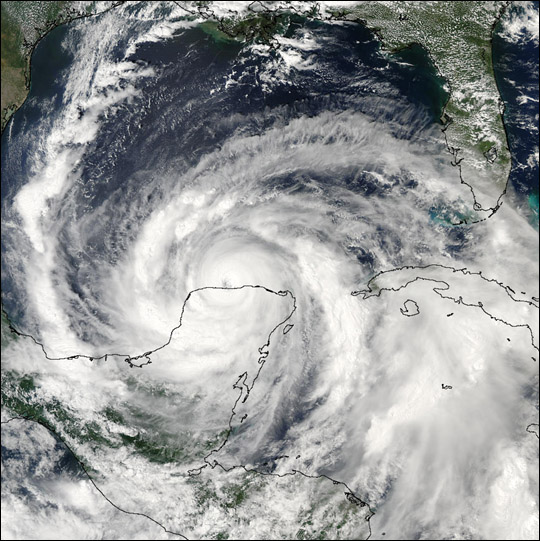 Tropical Storm Isidore. Therefore with the maximum sustained winds approaching 125 mph (205 km/hr). Also this Hurricane Isidore is just skirting the coast of the Yucatan Peninsula. The eye is clearly visible in this image and has an approximate diameter of 20 nautical miles. Isidore is expected to continue on a westward path for the next 24 hours.