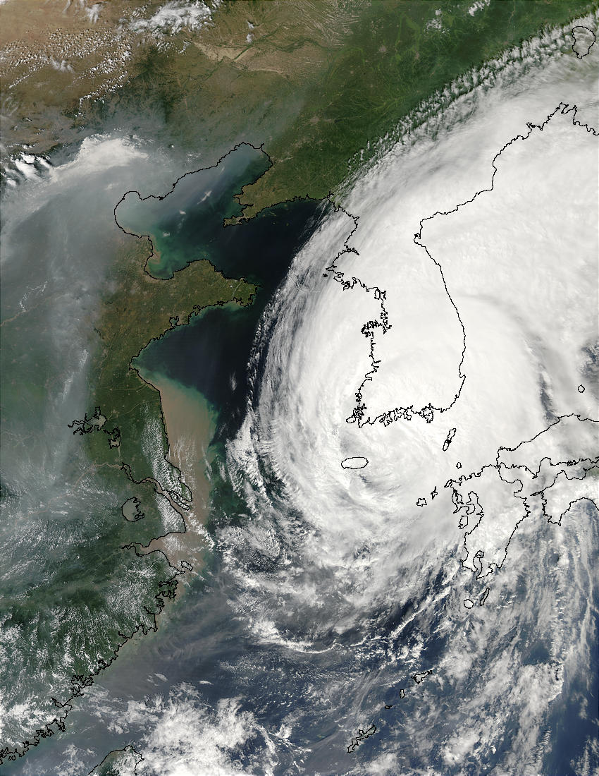 Typhoon Rusa (21W) Over Korea. In this series of true-color images from the Moderate Resolution Imaging Spectroradiometer (MODIS). Therefore the Typhoon Rusa can be seen menacing first Japan and then Korea. Also the series includes images captured by the Terra and Aqua MODIS instruments between August 27 and August 31, 2002.