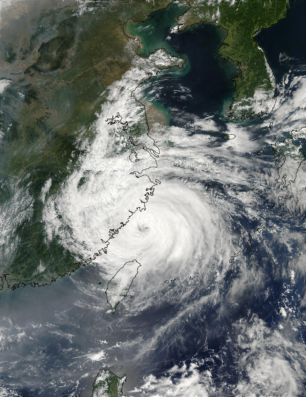 Typhoon Sinlaku (22W) Over China Coast. After tearing through the Okinawan island chain and Taiwan late last week. The Typhoon Sinlaku slammed into China this weekend, causing as many as 26 deaths and $100 million in destruction. Therefore the typhoon is shown here in a true-color image taken on September 7, 2002. Also by the Moderate Resolution Imaging Spectroradiometer (MODIS), flying aboard NASA Aqua spacecraft.