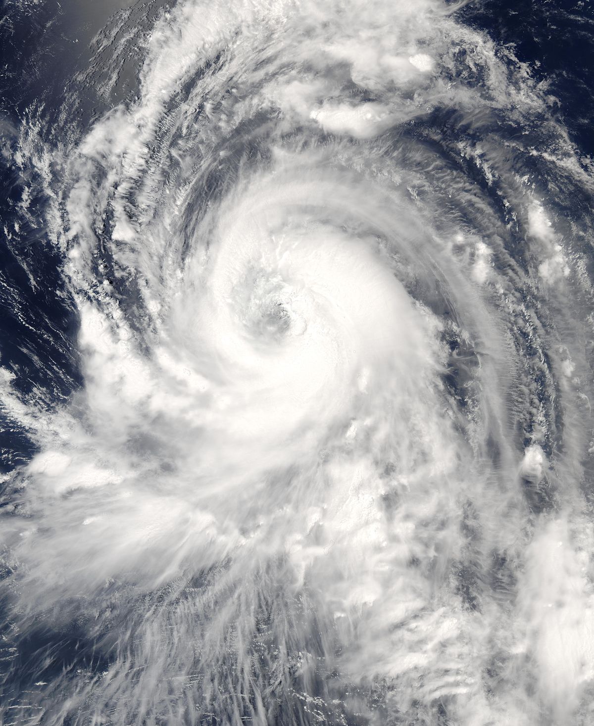 Typhoon Tingting. The MODIS instrument onboard NASA’s Aqua satellite captured this true-color image of Typhoon Tingting on June 29, 2004 at 3:45 UTC. At that time, Tingting was located approximately 345 miles south-southeast of Iwo Jima and was packing sustained winds of 92 mph with higher gusts to 115 mph. The storm was forecast to strengthen and continue on a west-northwest path.