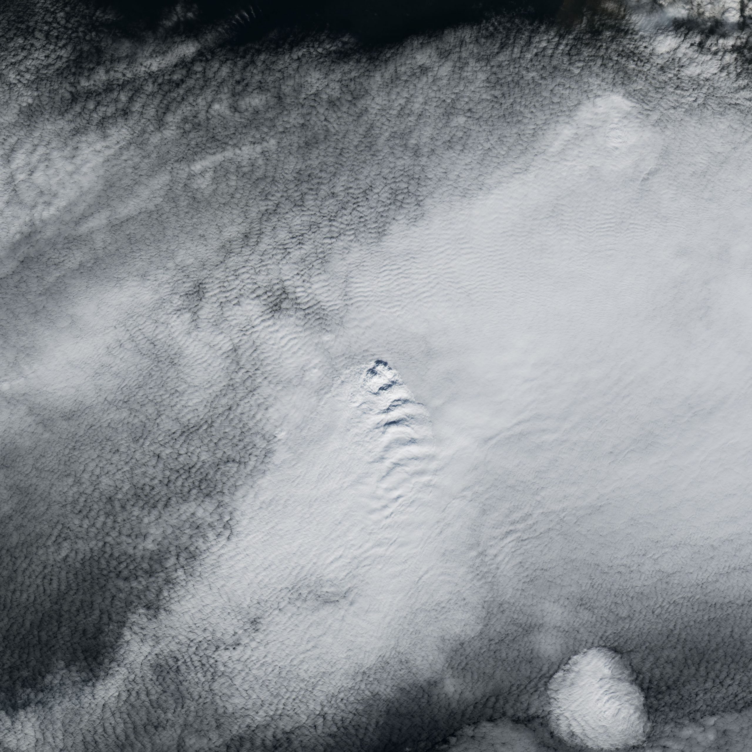 The clouds in this particular image may be related to the ongoing eruption of Fagradalsfjall, a shield volcano on Iceland’s Reykjanes peninsula. If so, the wave clouds were formed by the collision of different air masses. Iceland is a Nordic island country in the North Atlantic Ocean, with a population of 356,991 and an area of 103,000 km (40,000 sq mi), making it the most sparsely populated country in Europe. The capital and largest city is Reykjavík. Reykjavík and the surrounding areas in the southwest of the country are home to over two-thirds of the population. Iceland is volcanically and geologically active. The interior consists of a plateau characterised by sand and lava fields, mountains, and glaciers, and many glacial rivers flow to the sea through the lowlands.