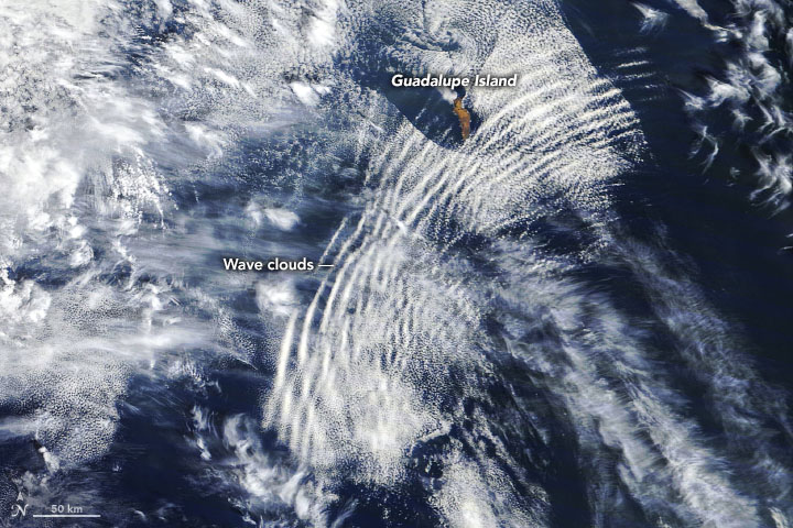 Wave clouds over the Pacific Ocean Today’s Image of the Day from NASA Earth Observatory features a series of undulating cloud bands, or wave clouds, over the Pacific Ocean near Baja California.