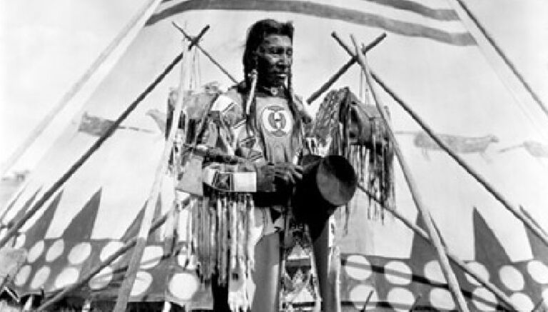 Weasel Calf of the Siksika Nation poses in full ceremonial dress in a photo from about 1910. The Siksika are part of the Blackfoot Confederacy from Alberta, Canada. Yet members of the tribe once roamed as far south as the Yellowstone River in Montana. And they had the nomadic lives of Plains Indians, hunting buffalo and living off the land. The roughly 7,500 Siksika people across Canada today may just get their meat pre-caught, though… Photo Credit: Provincial Archives of Alberta