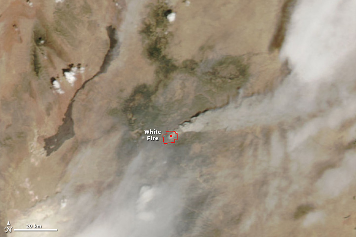 Dense smoke billows from the White Fire in southern New Mexico in this image, taken by the Moderate Resolution Imaging Spectroradiometer (MODIS) on NASA’s Aqua satellite on April 3, 2011. The fire, outlined in red, started on April 3 and grew quickly under strong winds. The fire had burned through about 6,000 acres of forest in steep, rocky terrain, destroying five homes and several outbuildings by 8:30 a.m. the following morning, said New Mexico Fire Information.