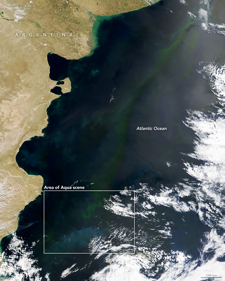Today’s Image of the Day from NASA Earth Observatory features widespread phytoplankton blooms in the Atlantic Ocean off of South America. According to NASA, the blooms stretched across hundreds of kilometers.