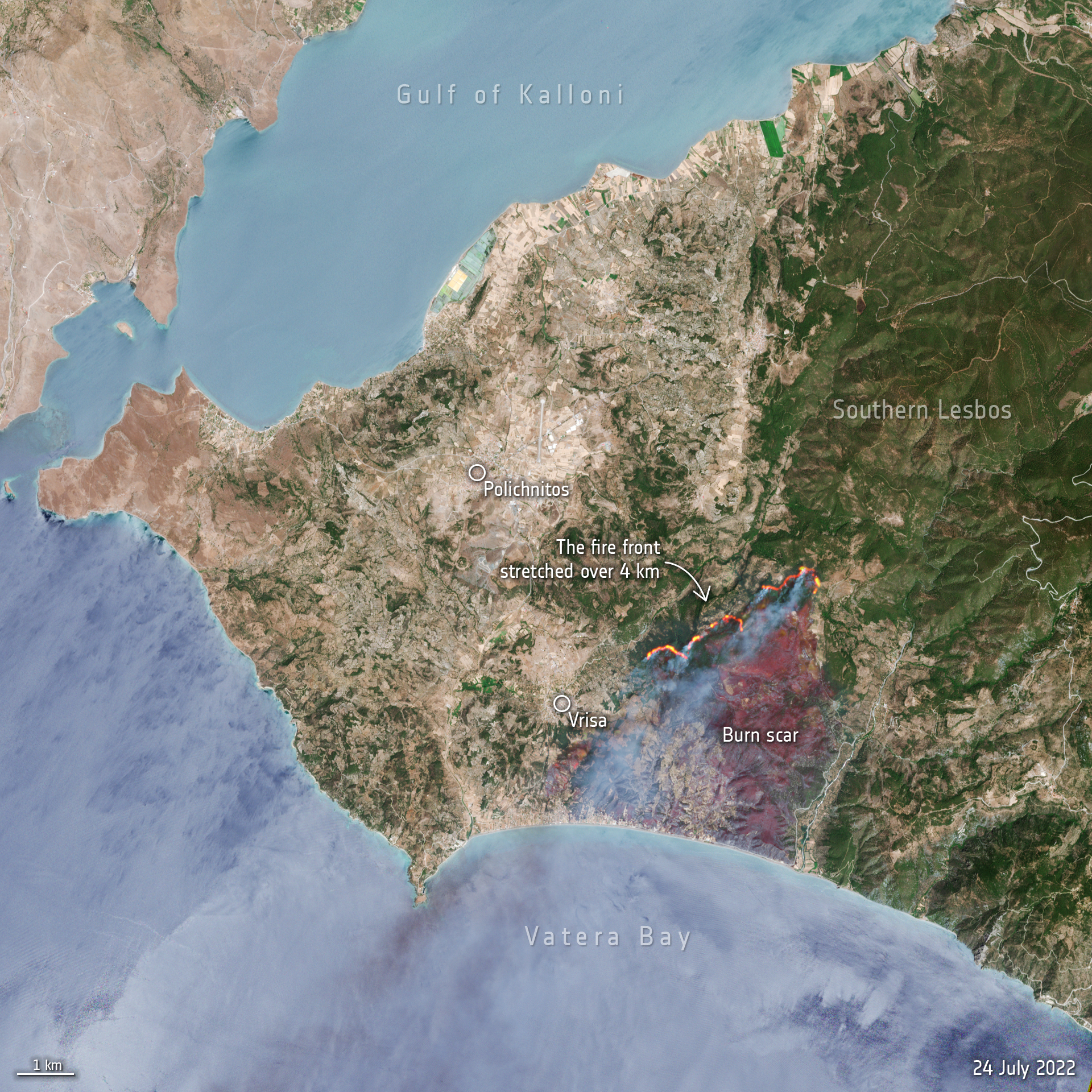 “The fire, which has been raging near the coastal area of Vatera, a popular tourist destination, has burned pine forest, shrubland and cultivated fields,” says ESA.