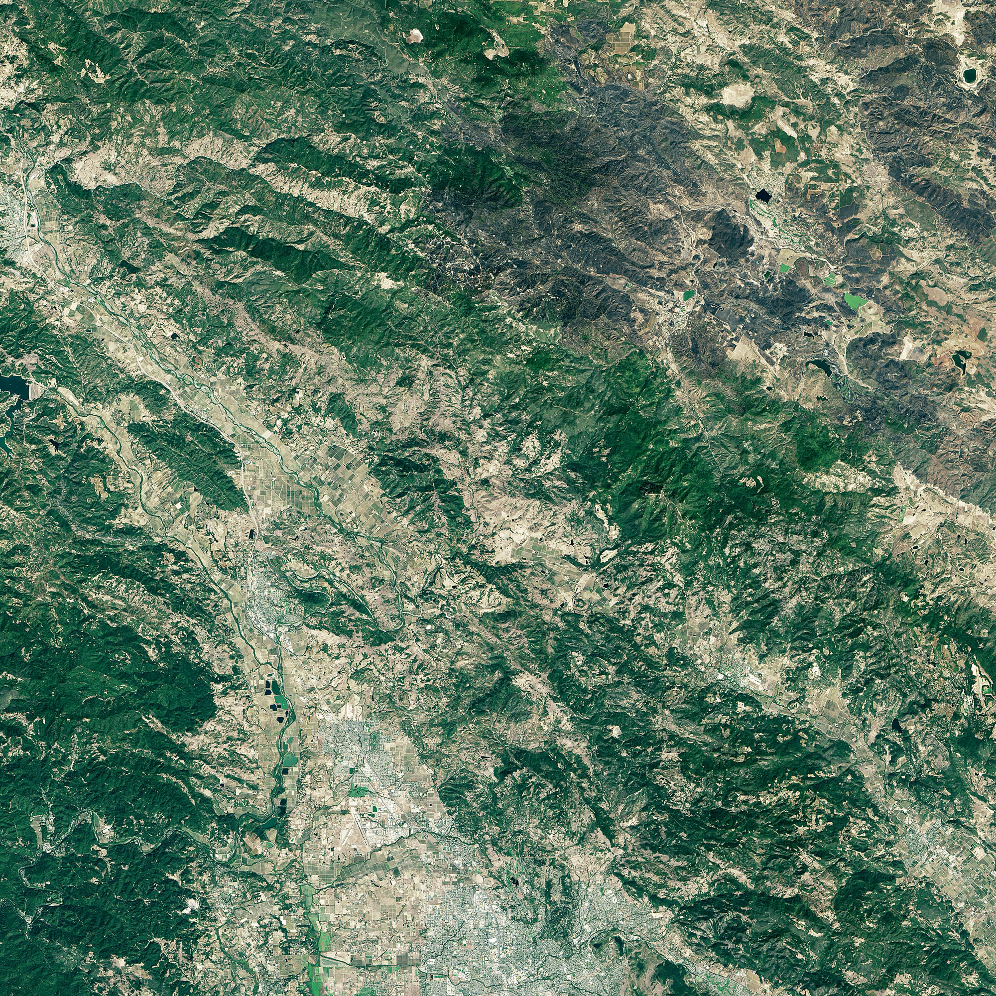 So when a weather system delivered abnormally hot temperatures and gusty winds to Napa, Sonoma, and Lake counties in northern California, the forests were primed to burn intensely. The first spark likely came from a shed fire in the town of Cobb on September 12, 2015. Once it had escaped the shed, the fire spread with such speed and intensity that firefighters could do little to slow it. Within 48 hours, the inferno had burned an area twice as large as Manhattan as it raced southeast along ridges in Boggs Mountain State Forest toward the communities of Harbin Springs, Anderson Springs, and Middletown.