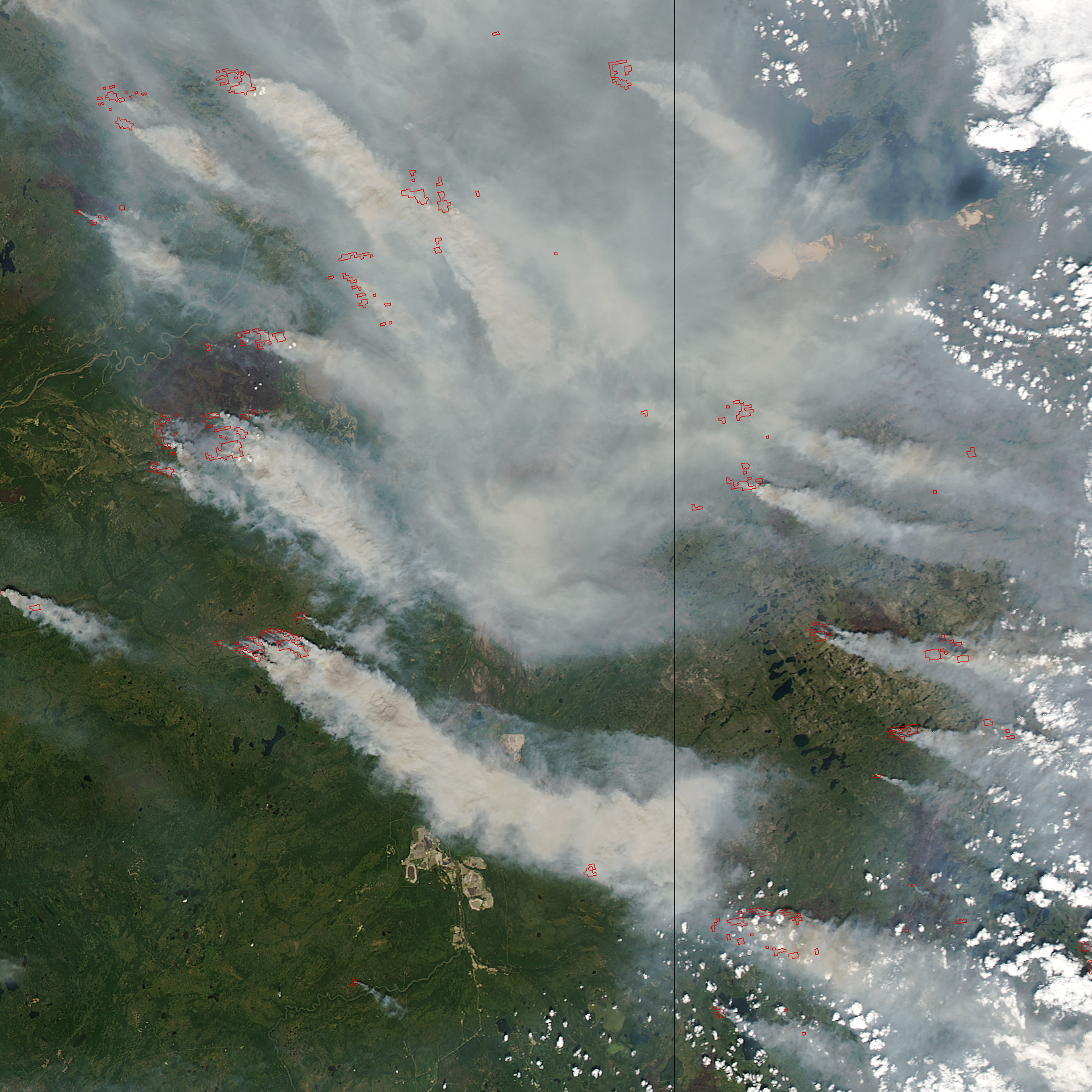 On June 28, 2015, the Moderate Resolution Imaging Spectroradiometer (MODIS) on NASA’s Aqua satellite captured this image of wildfires burning in Alberta, north of the Athabasa oil sands. Actively burning areas, detected by the thermal bands on MODIS, are outlined in red, while forests appear dark green. Also Wildfires in Alberta and Saskatchewan have caused massive amounts of damage to the land.