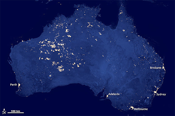 This nighttime image of Wildfires light up Western Australia was cropped from the Suomi NPP “Black Marble” released by NASA and the National Oceanic and Atmospheric Administration in December 2012.