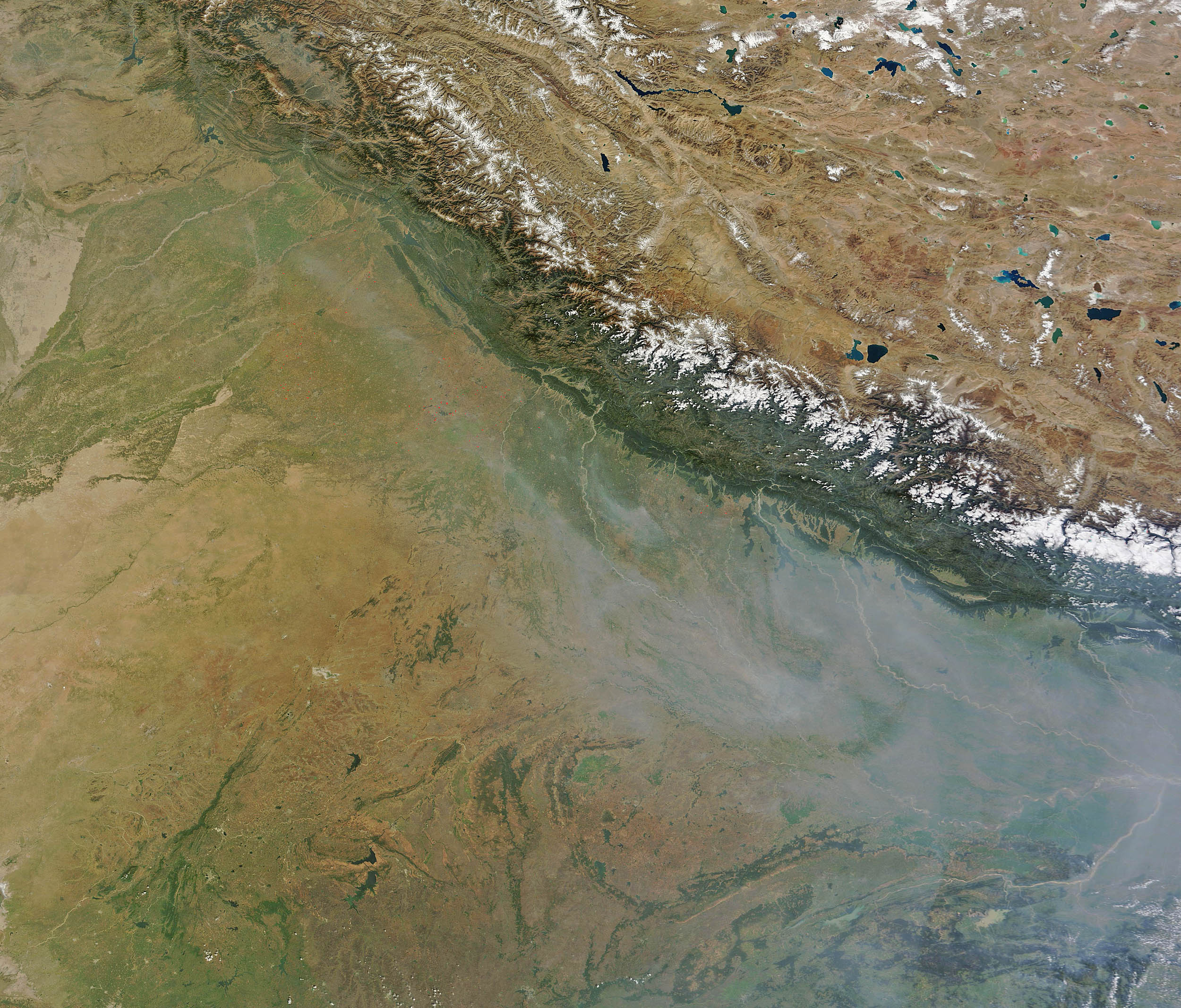 A heavy blanket of smoke filled the air south of the Himalayas in northwest India as dozens of actively burning fires speckled the landscape in northwest India in mid-October 2016. The Moderate Resolution Imaging Spectroradiometer (MODIS) aboard NASA’s Terra satellite captured this true-color image on October 17.